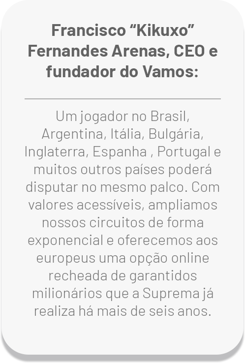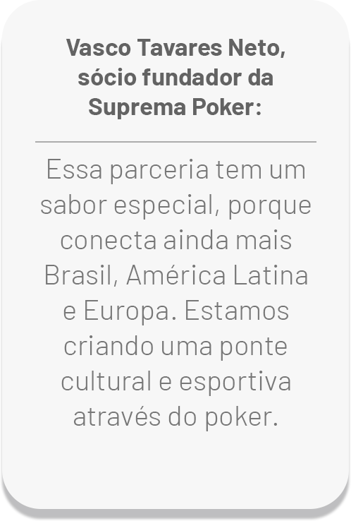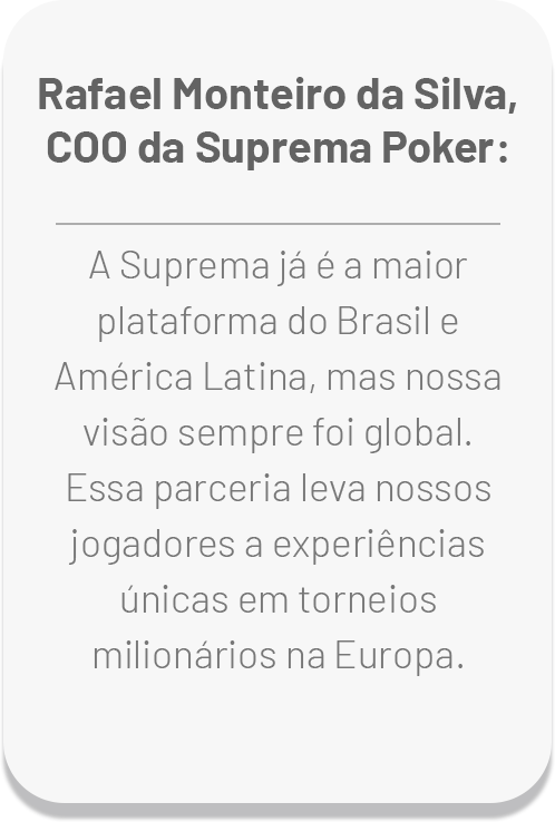 Com essa união, nasce o projeto que abre satélites exclusivos para jogadores de todo o continente europeu, além dos países onde a Suprema já atua, especialmente no Brasil e na América Latina. E o melhor: com buy-ins acessíveis a partir de apenas €16 (cerca de 100 reais), permitindo que qualquer jogador possa sonhar com os grandes palcos internacionais.