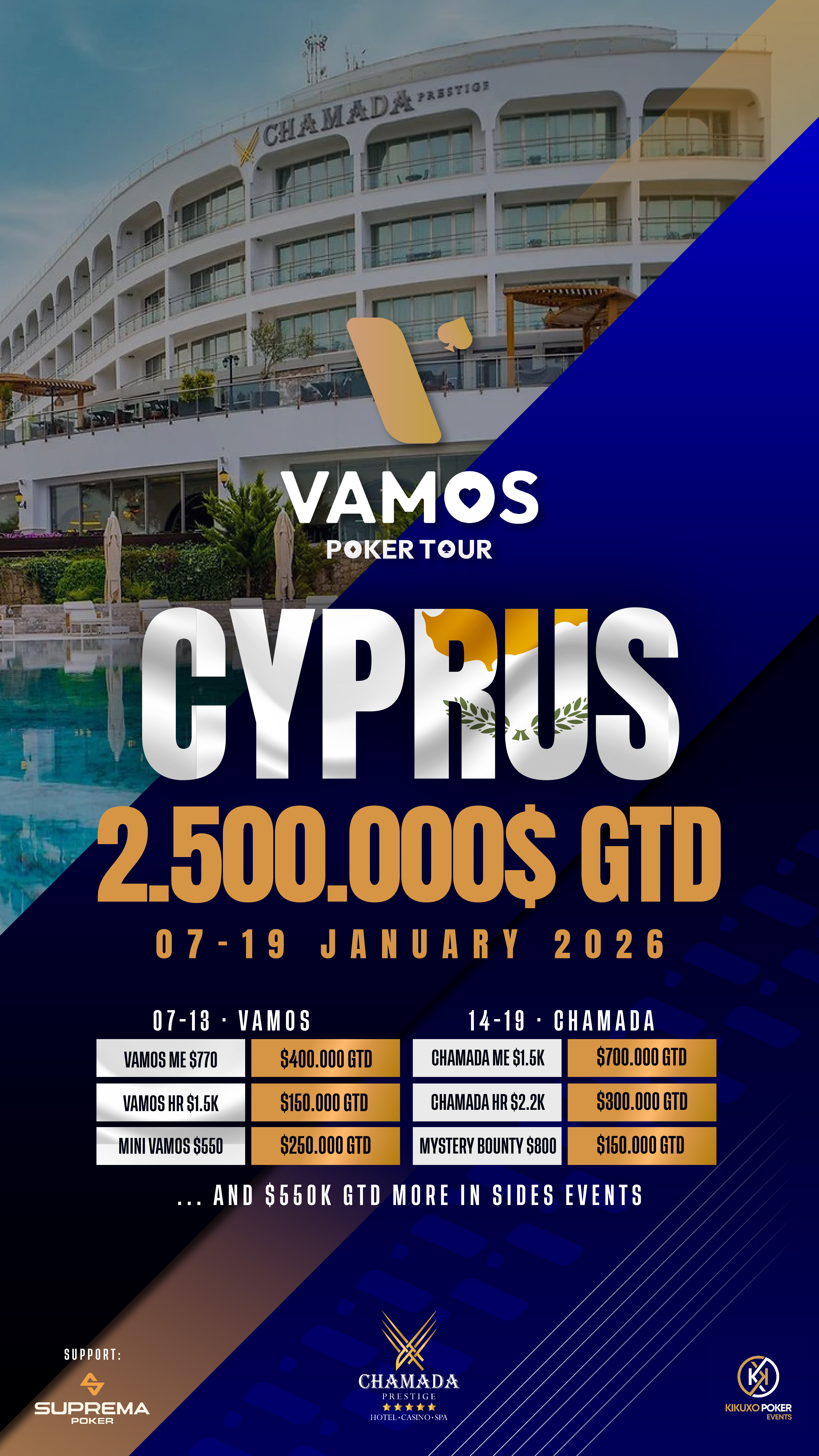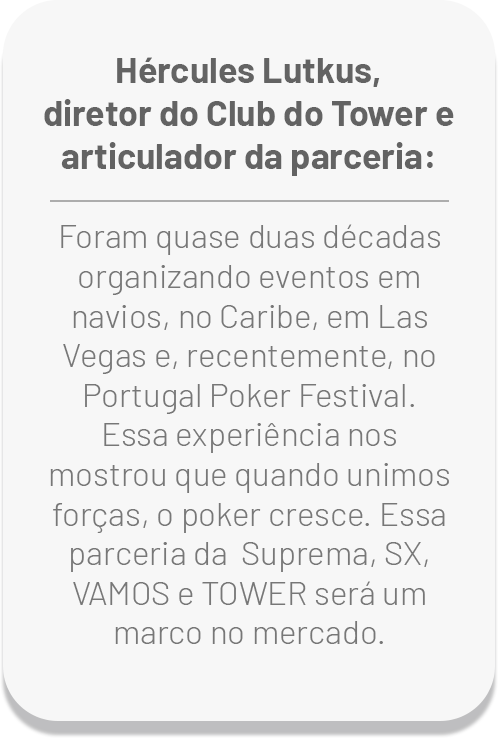A Suprema Poker, maior plataforma B2B do planeta — que distribui cerca de meio bilhão de reais em torneios garantidos por ano e reúne mais de 200 mil jogadores ativos — e a SX Poker, administradora de 35% dos 300 clubes associados da Suprema e considerada o maior grupo de poker do mundo, uniram-se ao Vamos Poker Tour (VPT), circuito europeu live surgido em 2023 e que já distribuiu cerca de 10 milhões de euros desde então.